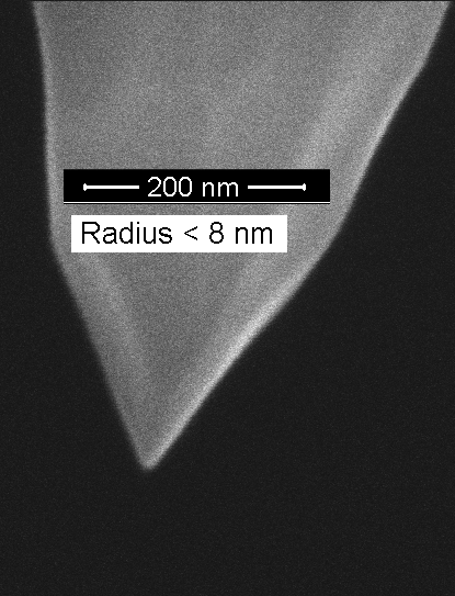 Material: Solid platinum or platinum-iridium probe tip and cantilever supported on standard AFM probe sized ceramic chip, connected to conductive gold bonding pad with conductive epoxy. RMN also has probes available without gold contact pad, to help reduce stray capacitance.