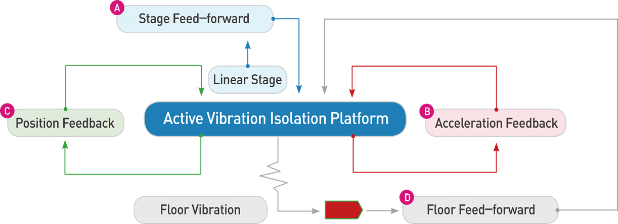When the isolated base is disturbed by vibrations, the position feedback measures displacement through position sensors that transmit signals into the digital controller. After receiving the signals from the sensors, the digital controller drives actuators to return its original position, improving the position accuracy. - D Floor Feed-Forward
