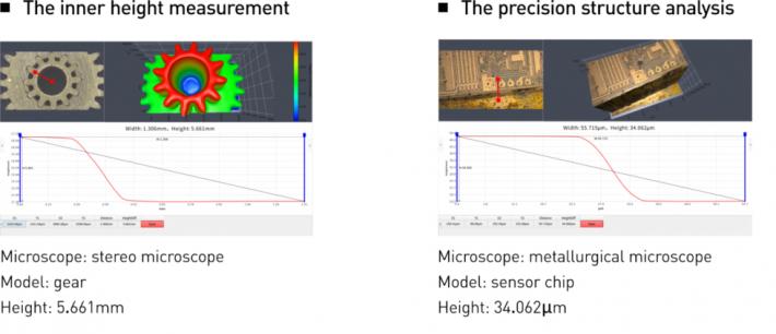 Only one click to create a 3D image, then the sample can be observed in real color or pseudo-color model with 360° rotation, measure any position, and record data in real-time. With the metallographic microscope of 10 times the objective lens, the Z-axis measurement accuracy, and repeatability is±2 micron and±1 micron. The higher magnification objective lens, and the higher precision data.